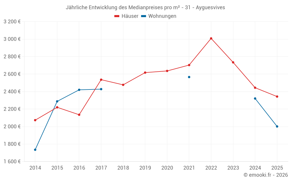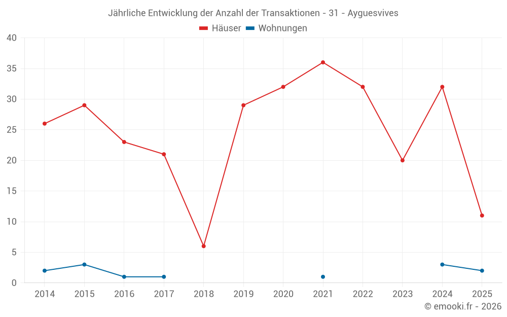 Der Durchschnittspreis auf den 28 Hausgeschäften der letzten 12 Monate in der Gemeinde Ayguesvives betrug 2 414 € pro Quadratmeter für einen mittleren Immobilienwert von 222 726 €. Über diesen Zeitraum hinweg lagen 60% der Transaktionen zwischen 1 894 und 3 134 € pro Quadratmeter (vom 2. bis zum 8. Dezil).