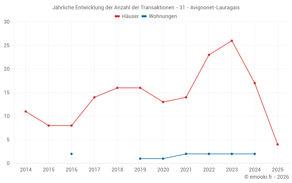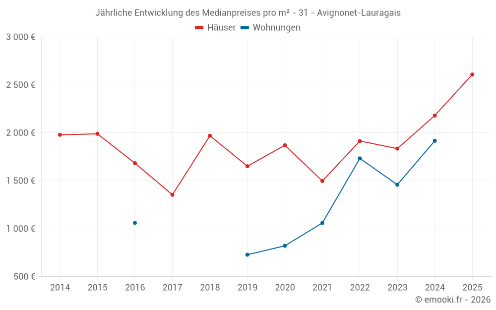 Der Durchschnittspreis auf den 35 Hausgeschäften der letzten 24 Monate in der Gemeinde Avignonet-Lauragais betrug 2 063 € pro Quadratmeter für einen mittleren Immobilienwert von 212 000 €. Über diesen Zeitraum hinweg lagen 60% der Transaktionen zwischen 1 425 und 2 707 € pro Quadratmeter (vom 2. bis zum 8. Dezil).