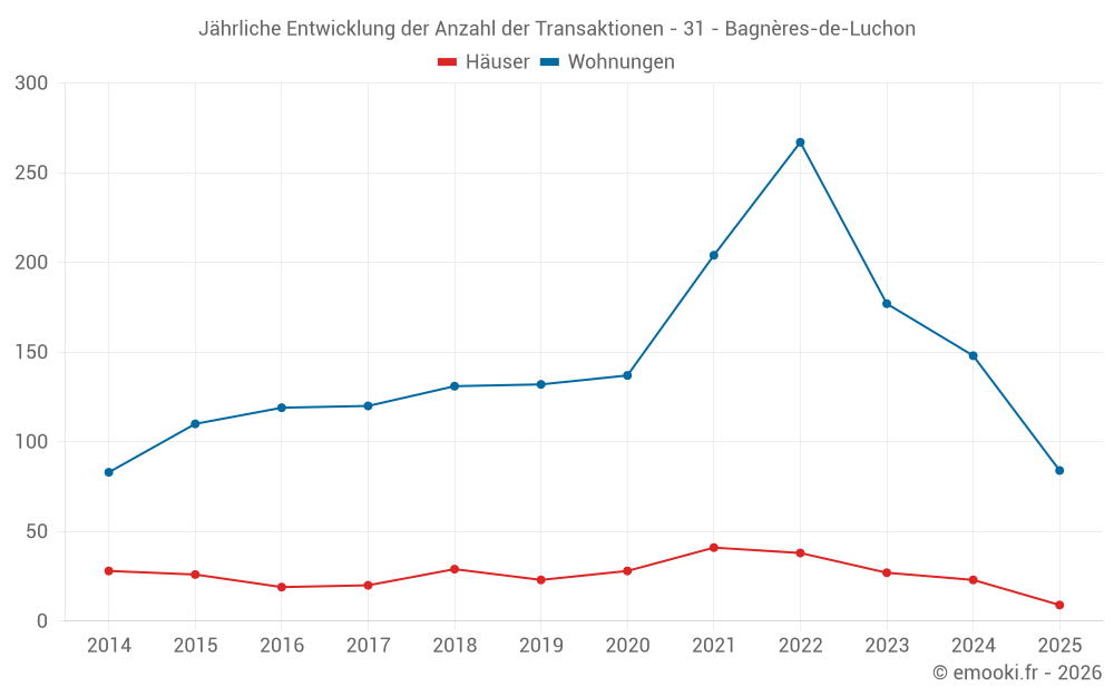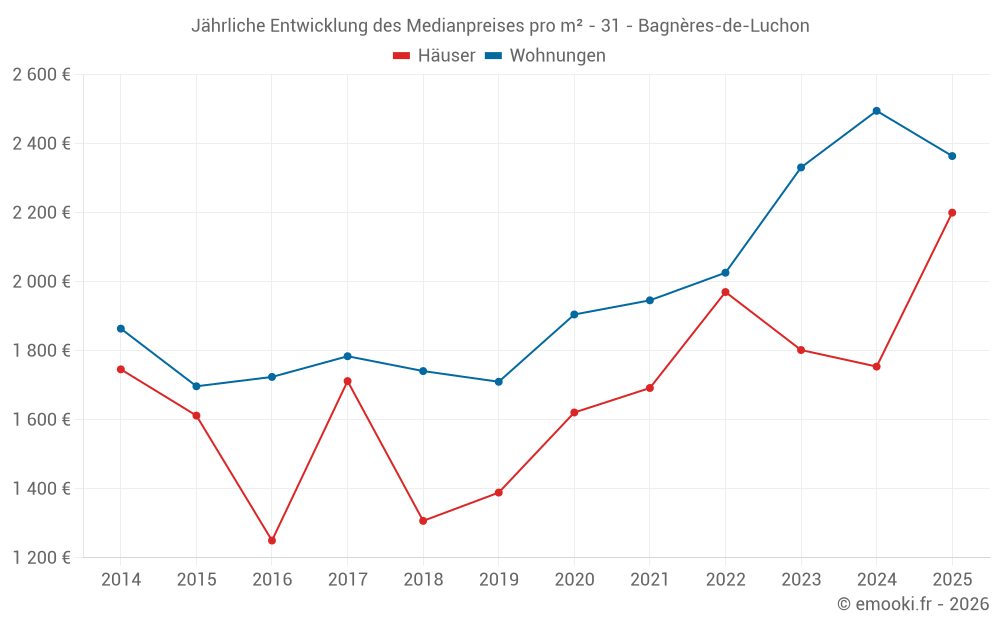 Der Durchschnittspreis auf den 21 Hausgeschäften der letzten 12 Monate in der Gemeinde Bagnères-de-Luchon betrug 1 658 € pro Quadratmeter für einen mittleren Immobilienwert von 237 760 €. Über diesen Zeitraum hinweg lagen 60% der Transaktionen zwischen 948 und 2 642 € pro Quadratmeter (vom 2. bis zum 8. Dezil).