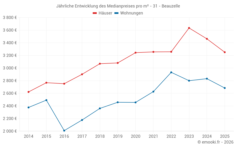 Der Durchschnittspreis auf den 38 Hausgeschäften der letzten 12 Monate in der Gemeinde Beauzelle betrug 3 256 € pro Quadratmeter für einen mittleren Immobilienwert von 312 368 €. Über diesen Zeitraum hinweg lagen 60% der Transaktionen zwischen 2 624 und 3 811 € pro Quadratmeter (vom 2. bis zum 8. Dezil).