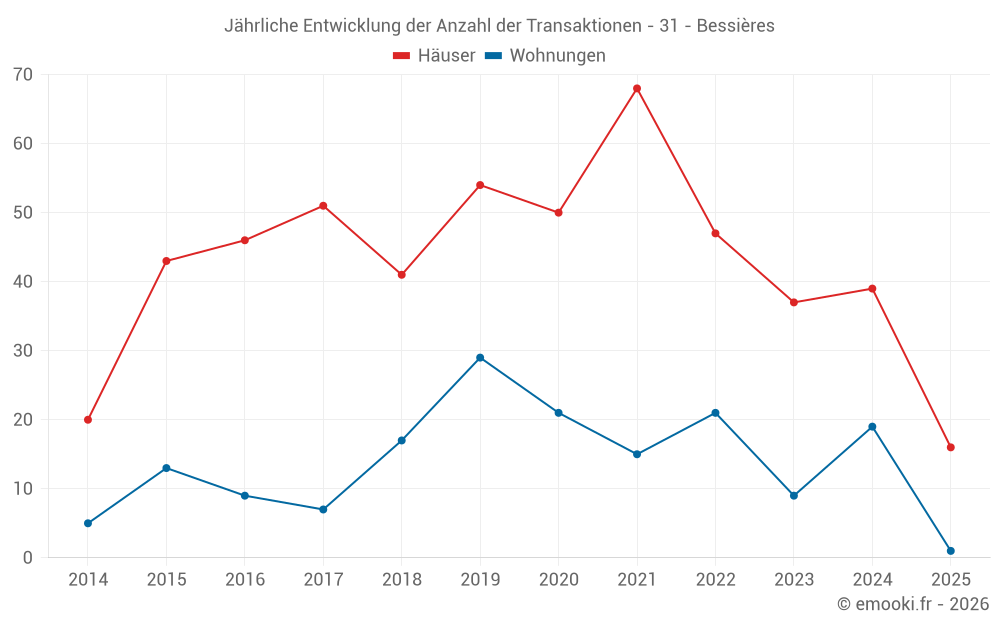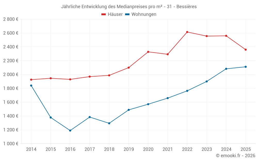 Der Durchschnittspreis auf den 38 Hausgeschäften der letzten 12 Monate in der Gemeinde Bessières betrug 2 360 € pro Quadratmeter für einen mittleren Immobilienwert von 233 650 €. Über diesen Zeitraum hinweg lagen 60% der Transaktionen zwischen 1 975 und 2 772 € pro Quadratmeter (vom 2. bis zum 8. Dezil).
