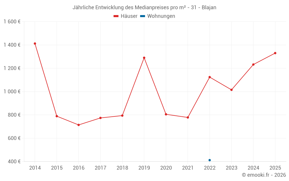 Der Durchschnittspreis auf den 14 Hausgeschäften der letzten 24 Monate in der Gemeinde Blajan betrug 1 146 € pro Quadratmeter für einen mittleren Immobilienwert von 107 500 €. Über diesen Zeitraum hinweg lagen 60% der Transaktionen zwischen 404 und 1 714 € pro Quadratmeter (vom 2. bis zum 8. Dezil).