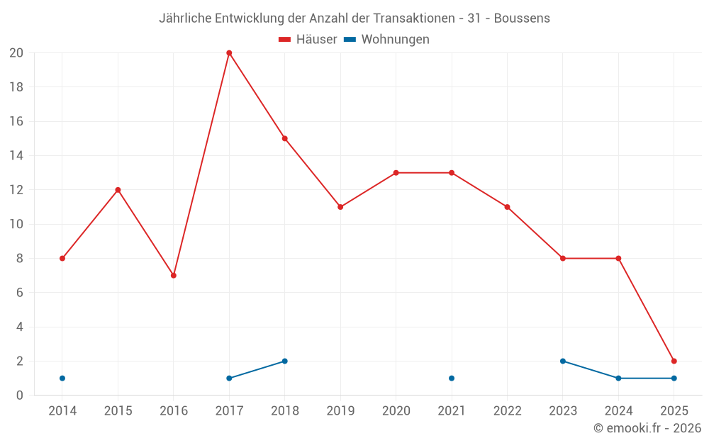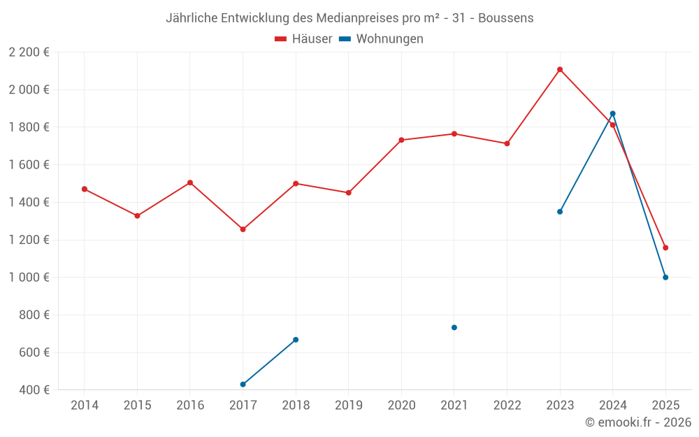 Der Durchschnittspreis auf den 15 Hausgeschäften der letzten 24 Monate in der Gemeinde Boussens betrug 1 850 € pro Quadratmeter für einen mittleren Immobilienwert von 150 000 €. Über diesen Zeitraum hinweg lagen 60% der Transaktionen zwischen 1 007 und 2 235 € pro Quadratmeter (vom 2. bis zum 8. Dezil).