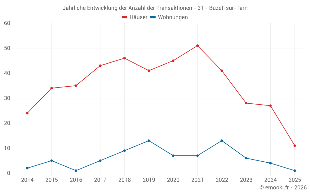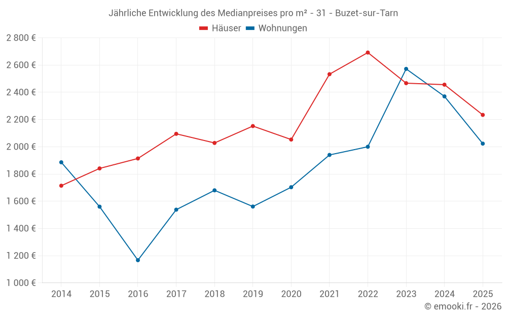 Der Durchschnittspreis auf den 28 Hausgeschäften der letzten 12 Monate in der Gemeinde Buzet-sur-Tarn betrug 2 474 € pro Quadratmeter für einen mittleren Immobilienwert von 259 825 €. Über diesen Zeitraum hinweg lagen 60% der Transaktionen zwischen 2 204 und 2 909 € pro Quadratmeter (vom 2. bis zum 8. Dezil).