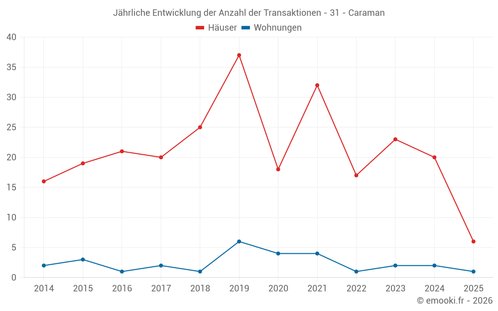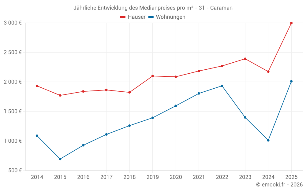 Der Durchschnittspreis auf den 16 Hausgeschäften der letzten 12 Monate in der Gemeinde Caraman betrug 2 572 € pro Quadratmeter für einen mittleren Immobilienwert von 280 750 €. Über diesen Zeitraum hinweg lagen 60% der Transaktionen zwischen 1 500 und 3 111 € pro Quadratmeter (vom 2. bis zum 8. Dezil).