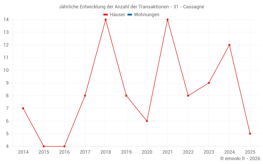 Der Durchschnittspreis auf den 21 Hausgeschäften der letzten 24 Monate in der Gemeinde Cassagne betrug 1 444 € pro Quadratmeter für einen mittleren Immobilienwert von 130 000 €. Über diesen Zeitraum hinweg lagen 60% der Transaktionen zwischen 932 und 1 772 € pro Quadratmeter (vom 2. bis zum 8. Dezil).