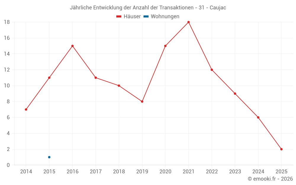 Der Durchschnittspreis auf den 15 Hausgeschäften der letzten 24 Monate in der Gemeinde Caujac betrug 1 896 € pro Quadratmeter für einen mittleren Immobilienwert von 185 000 €. Über diesen Zeitraum hinweg lagen 60% der Transaktionen zwischen 1 254 und 2 169 € pro Quadratmeter (vom 2. bis zum 8. Dezil).