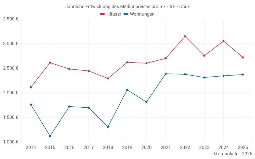 Der Durchschnittspreis auf den 18 Wohnungstransaktionen der letzten 24 Monate in der Gemeinde Daux betrug 2 300 € pro Quadratmeter für einen mittleren Immobilienwert von 133 760 €. Über diesen Zeitraum hinweg lagen 60% der Transaktionen zwischen 2 125 und 2 502 € pro Quadratmeter (vom 2. bis zum 8. Dezil).
