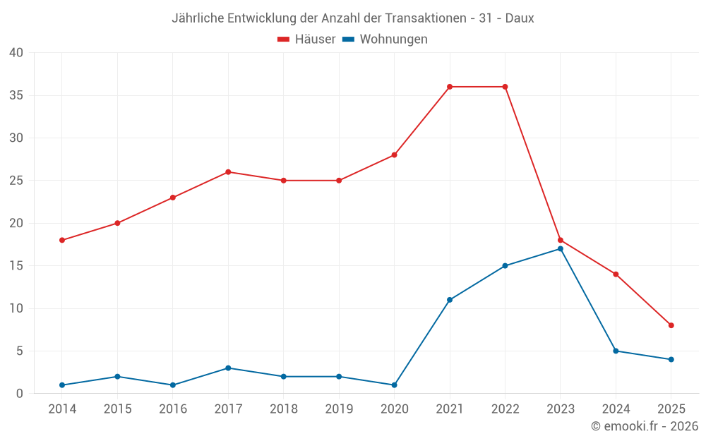 Der Durchschnittspreis auf den 32 Hausgeschäften der letzten 24 Monate in der Gemeinde Daux betrug 2 760 € pro Quadratmeter für einen mittleren Immobilienwert von 275 750 €. Über diesen Zeitraum hinweg lagen 60% der Transaktionen zwischen 1 966 und 3 425 € pro Quadratmeter (vom 2. bis zum 8. Dezil).