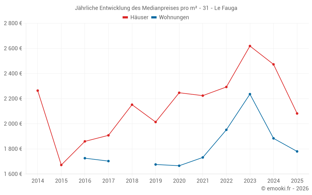 Der Durchschnittspreis auf den 19 Hausgeschäften der letzten 12 Monate in der Gemeinde Le Fauga betrug 2 391 € pro Quadratmeter für einen mittleren Immobilienwert von 230 400 €. Über diesen Zeitraum hinweg lagen 60% der Transaktionen zwischen 2 023 und 2 925 € pro Quadratmeter (vom 2. bis zum 8. Dezil).