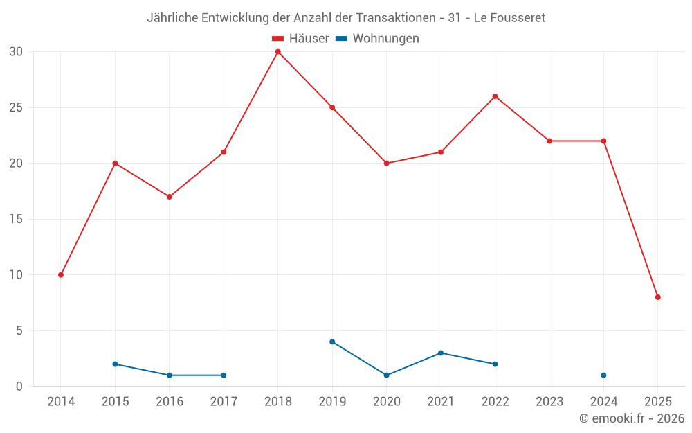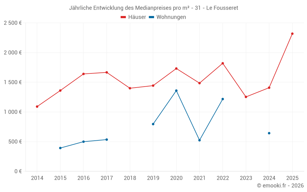 Der Durchschnittspreis auf den 19 Hausgeschäften der letzten 12 Monate in der Gemeinde Le Fousseret betrug 1 764 € pro Quadratmeter für einen mittleren Immobilienwert von 205 000 €. Über diesen Zeitraum hinweg lagen 60% der Transaktionen zwischen 642 und 2 528 € pro Quadratmeter (vom 2. bis zum 8. Dezil).
