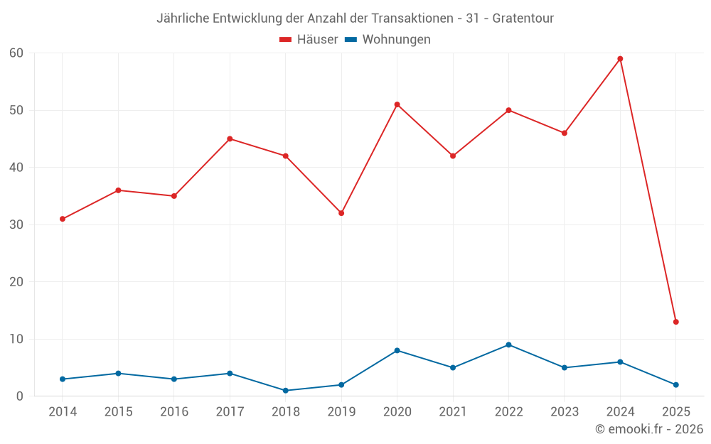 Der Durchschnittspreis auf den 47 Hausgeschäften der letzten 12 Monate in der Gemeinde Gratentour betrug 2 775 € pro Quadratmeter für einen mittleren Immobilienwert von 228 000 €. Über diesen Zeitraum hinweg lagen 60% der Transaktionen zwischen 2 637 und 3 013 € pro Quadratmeter (vom 2. bis zum 8. Dezil).