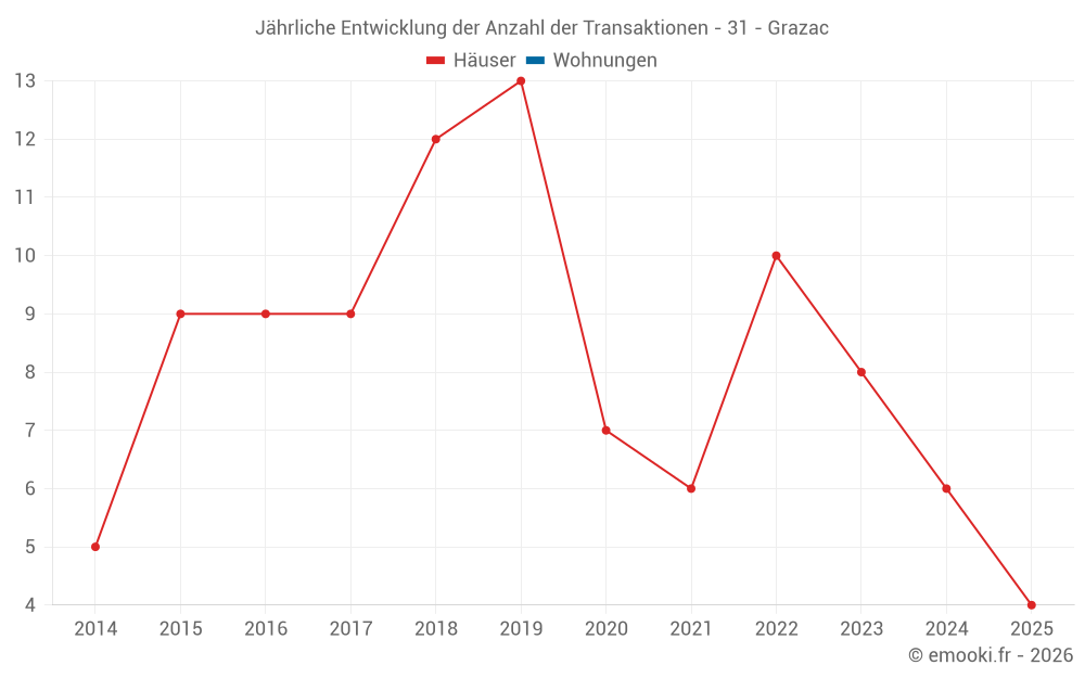 Der Durchschnittspreis auf den 16 Hausgeschäften der letzten 24 Monate in der Gemeinde Grazac betrug 2 078 € pro Quadratmeter für einen mittleren Immobilienwert von 262 000 €. Über diesen Zeitraum hinweg lagen 60% der Transaktionen zwischen 1 705 und 2 803 € pro Quadratmeter (vom 2. bis zum 8. Dezil).