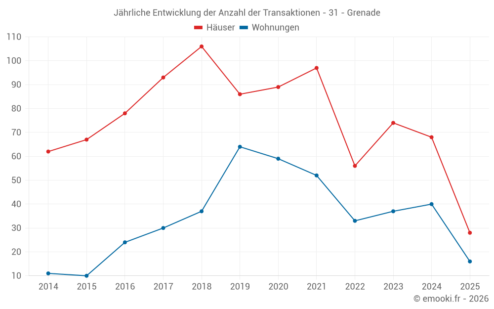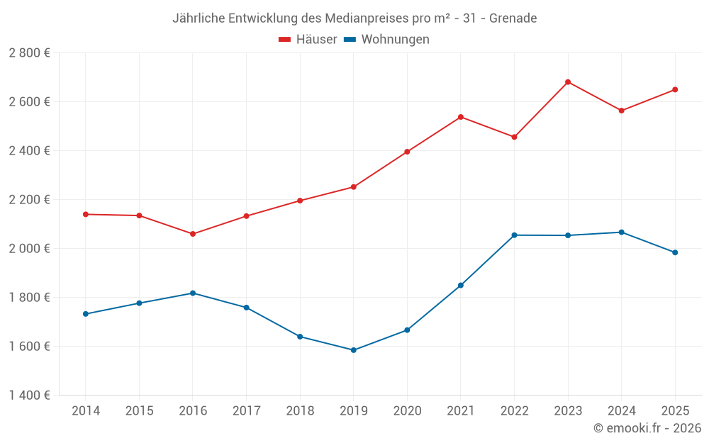 Der Durchschnittspreis auf den 35 Wohnungstransaktionen der letzten 12 Monate in der Gemeinde Grenade betrug 2 027 € pro Quadratmeter für einen mittleren Immobilienwert von 127 800 €. Über diesen Zeitraum hinweg lagen 60% der Transaktionen zwischen 1 799 und 2 192 € pro Quadratmeter (vom 2. bis zum 8. Dezil).