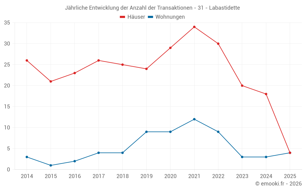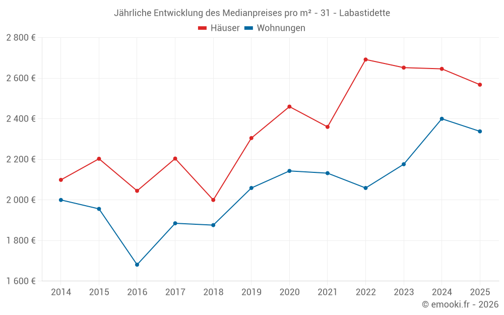 Der Durchschnittspreis auf den 30 Hausgeschäften der letzten 24 Monate in der Gemeinde Labastidette betrug 2 593 € pro Quadratmeter für einen mittleren Immobilienwert von 247 250 €. Über diesen Zeitraum hinweg lagen 60% der Transaktionen zwischen 2 312 und 2 860 € pro Quadratmeter (vom 2. bis zum 8. Dezil).