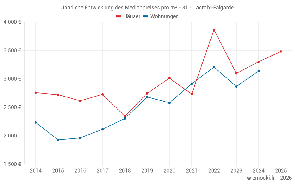 Der Durchschnittspreis auf den 31 Hausgeschäften der letzten 24 Monate in der Gemeinde Lacroix-Falgarde betrug 3 444 € pro Quadratmeter für einen mittleren Immobilienwert von 480 000 €. Über diesen Zeitraum hinweg lagen 60% der Transaktionen zwischen 2 621 und 4 027 € pro Quadratmeter (vom 2. bis zum 8. Dezil).