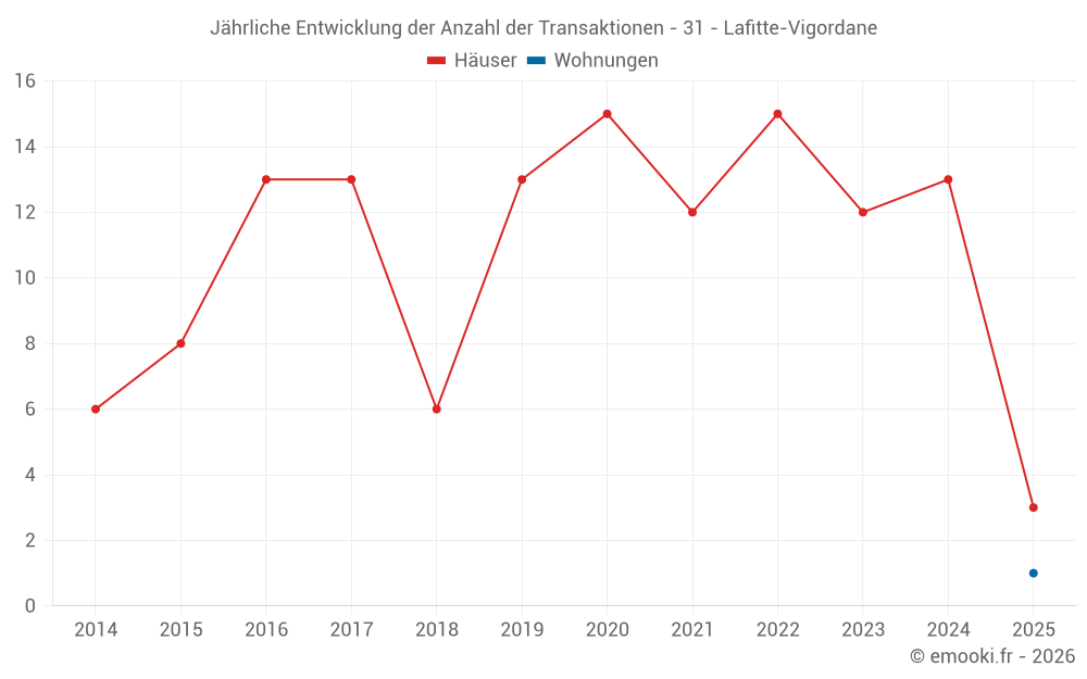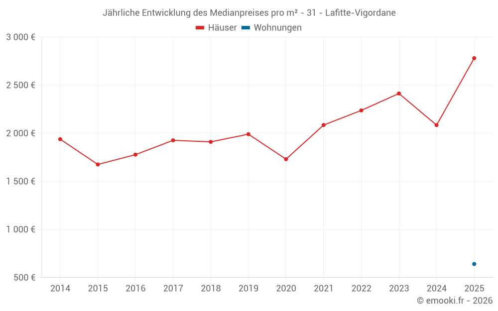 Der Durchschnittspreis auf den 22 Hausgeschäften der letzten 24 Monate in der Gemeinde Lafitte-Vigordane betrug 2 134 € pro Quadratmeter für einen mittleren Immobilienwert von 188 700 €. Über diesen Zeitraum hinweg lagen 60% der Transaktionen zwischen 1 225 und 2 475 € pro Quadratmeter (vom 2. bis zum 8. Dezil).