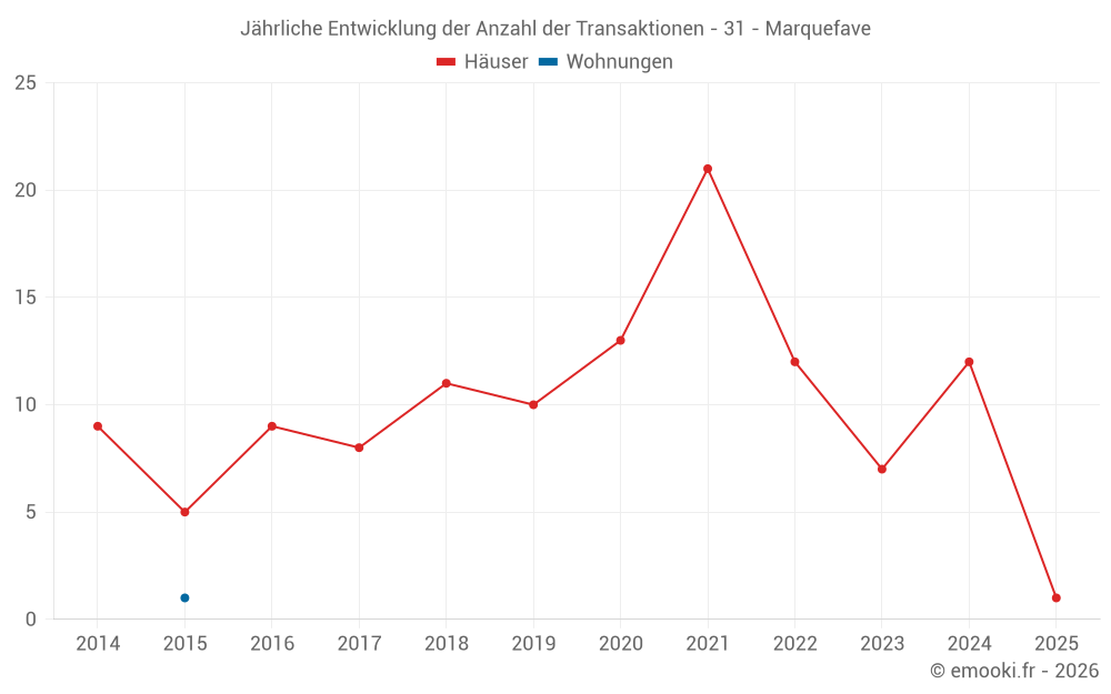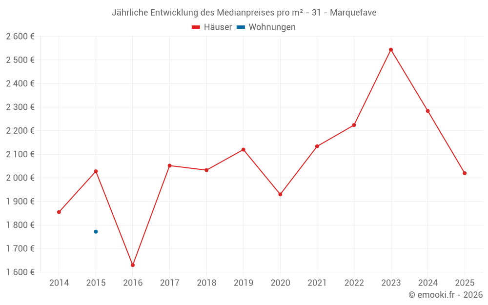 Der Durchschnittspreis auf den 17 Hausgeschäften der letzten 24 Monate in der Gemeinde Marquefave betrug 2 311 € pro Quadratmeter für einen mittleren Immobilienwert von 258 000 €. Über diesen Zeitraum hinweg lagen 60% der Transaktionen zwischen 2 029 und 2 590 € pro Quadratmeter (vom 2. bis zum 8. Dezil).