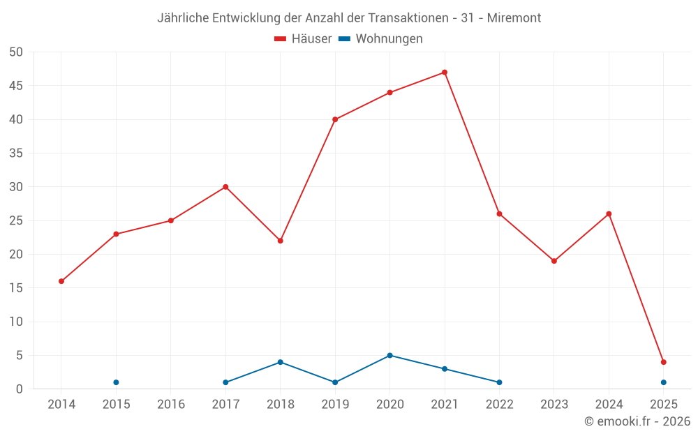 Der Durchschnittspreis auf den 22 Hausgeschäften der letzten 12 Monate in der Gemeinde Miremont betrug 2 624 € pro Quadratmeter für einen mittleren Immobilienwert von 231 500 €. Über diesen Zeitraum hinweg lagen 60% der Transaktionen zwischen 1 815 und 3 037 € pro Quadratmeter (vom 2. bis zum 8. Dezil).