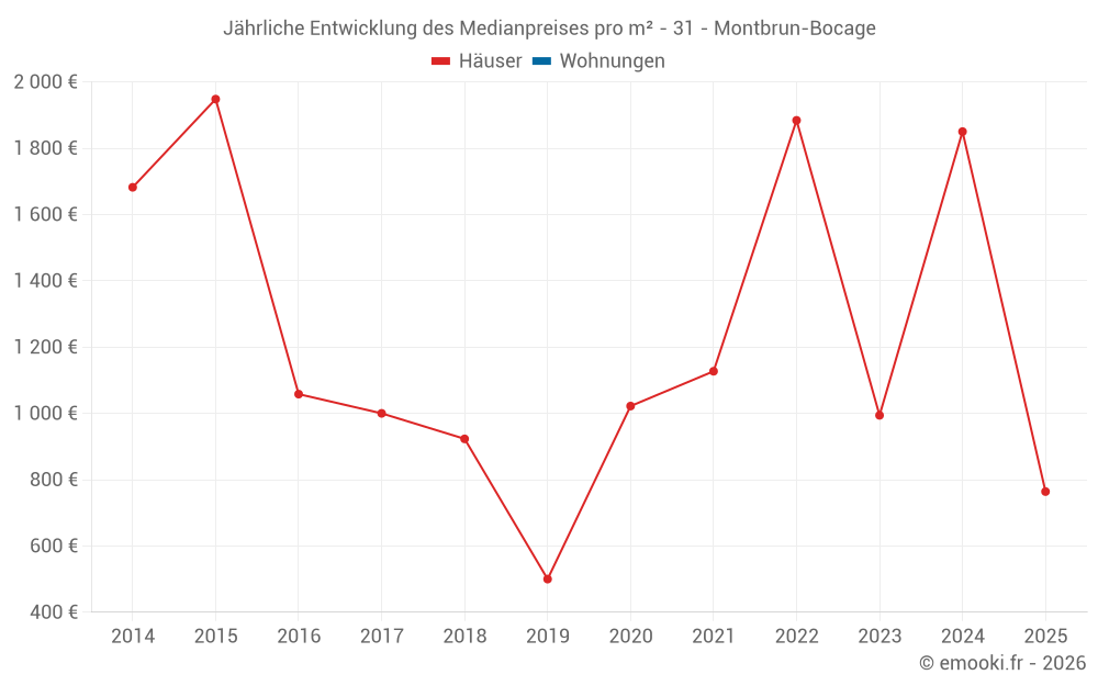 Der Durchschnittspreis auf den 20 Hausgeschäften der letzten 24 Monate in der Gemeinde Montbrun-Bocage betrug 1 514 € pro Quadratmeter für einen mittleren Immobilienwert von 151 310 €. Über diesen Zeitraum hinweg lagen 60% der Transaktionen zwischen 763 und 2 350 € pro Quadratmeter (vom 2. bis zum 8. Dezil).