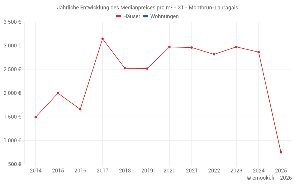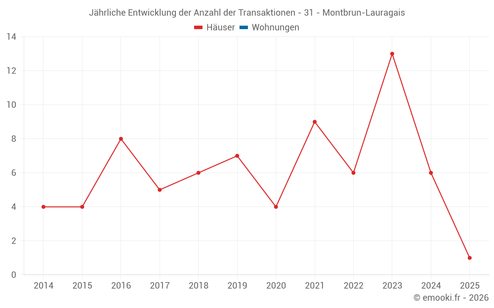 Der Durchschnittspreis auf den 15 Hausgeschäften der letzten 24 Monate in der Gemeinde Montbrun-Lauragais betrug 2 787 € pro Quadratmeter für einen mittleren Immobilienwert von 340 000 €. Über diesen Zeitraum hinweg lagen 60% der Transaktionen zwischen 2 020 und 3 223 € pro Quadratmeter (vom 2. bis zum 8. Dezil).