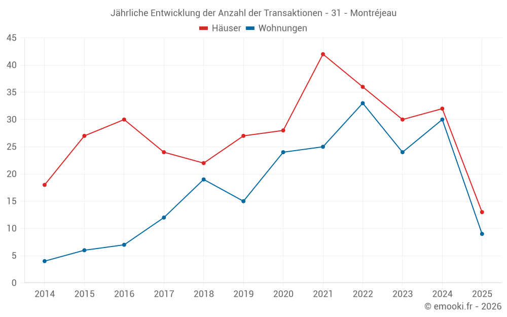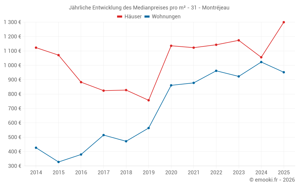 Der Durchschnittspreis auf den 25 Wohnungstransaktionen der letzten 12 Monate in der Gemeinde Montréjeau betrug 1 040 € pro Quadratmeter für einen mittleren Immobilienwert von 60 000 €. Über diesen Zeitraum hinweg lagen 60% der Transaktionen zwischen 787 und 1 295 € pro Quadratmeter (vom 2. bis zum 8. Dezil).