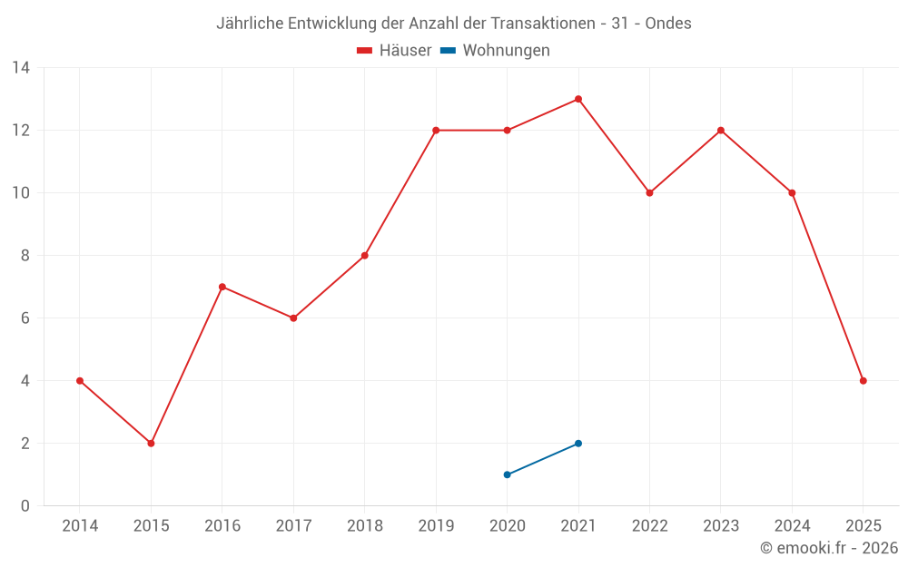 Der Durchschnittspreis auf den 21 Hausgeschäften der letzten 24 Monate in der Gemeinde Ondes betrug 2 625 € pro Quadratmeter für einen mittleren Immobilienwert von 245 300 €. Über diesen Zeitraum hinweg lagen 60% der Transaktionen zwischen 2 077 und 3 143 € pro Quadratmeter (vom 2. bis zum 8. Dezil).