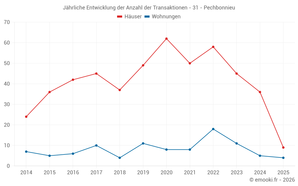 Der Durchschnittspreis auf den 16 Wohnungstransaktionen der letzten 24 Monate in der Gemeinde Pechbonnieu betrug 2 502 € pro Quadratmeter für einen mittleren Immobilienwert von 138 455 €. Über diesen Zeitraum hinweg lagen 60% der Transaktionen zwischen 2 289 und 3 032 € pro Quadratmeter (vom 2. bis zum 8. Dezil).