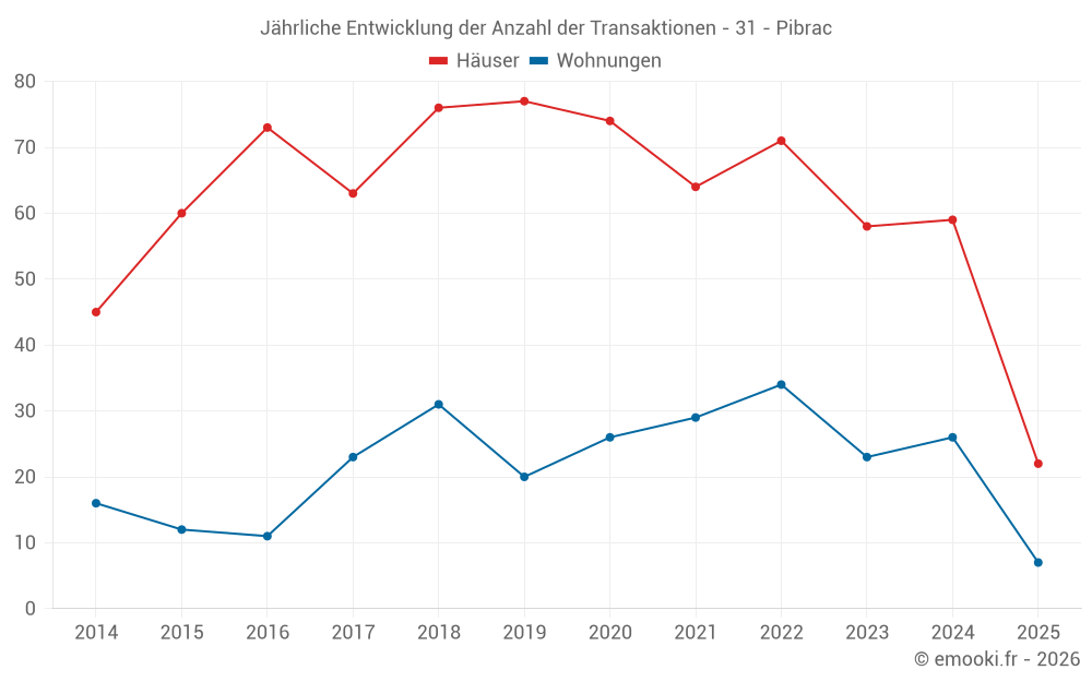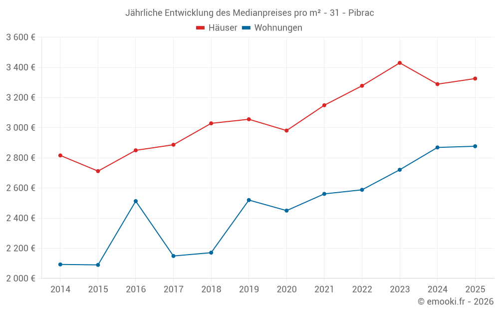 Der Durchschnittspreis auf den 22 Hausgeschäften der letzten 6 Monate in der Gemeinde Pibrac betrug 3 326 € pro Quadratmeter für einen mittleren Immobilienwert von 372 735 €. Über diesen Zeitraum hinweg lagen 60% der Transaktionen zwischen 3 001 und 3 995 € pro Quadratmeter (vom 2. bis zum 8. Dezil).