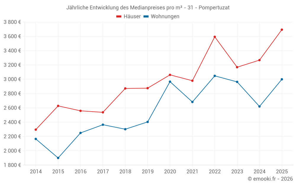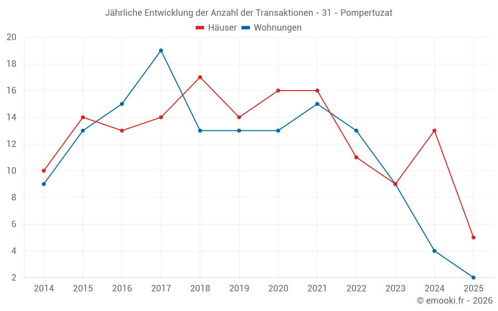 Der Durchschnittspreis auf den 22 Hausgeschäften der letzten 24 Monate in der Gemeinde Pompertuzat betrug 3 284 € pro Quadratmeter für einen mittleren Immobilienwert von 342 910 €. Über diesen Zeitraum hinweg lagen 60% der Transaktionen zwischen 2 535 und 3 482 € pro Quadratmeter (vom 2. bis zum 8. Dezil).