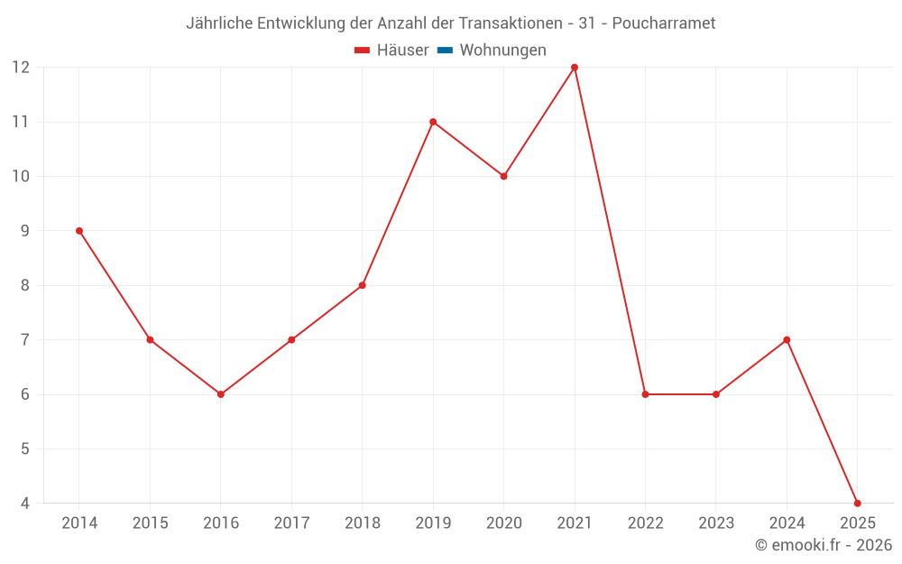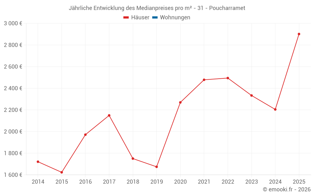 Der Durchschnittspreis auf den 14 Hausgeschäften der letzten 24 Monate in der Gemeinde Poucharramet betrug 2 202 € pro Quadratmeter für einen mittleren Immobilienwert von 247 735 €. Über diesen Zeitraum hinweg lagen 60% der Transaktionen zwischen 1 823 und 3 292 € pro Quadratmeter (vom 2. bis zum 8. Dezil).