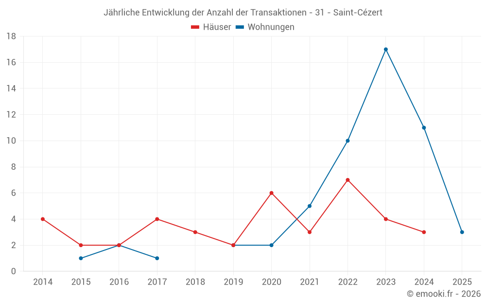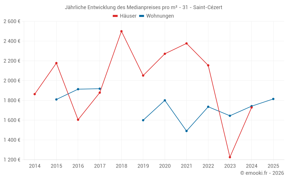 Der Durchschnittspreis auf den 22 Wohnungstransaktionen der letzten 24 Monate in der Gemeinde Saint-Cézert betrug 1 790 € pro Quadratmeter für einen mittleren Immobilienwert von 123 380 €. Über diesen Zeitraum hinweg lagen 60% der Transaktionen zwischen 1 403 und 1 900 € pro Quadratmeter (vom 2. bis zum 8. Dezil).