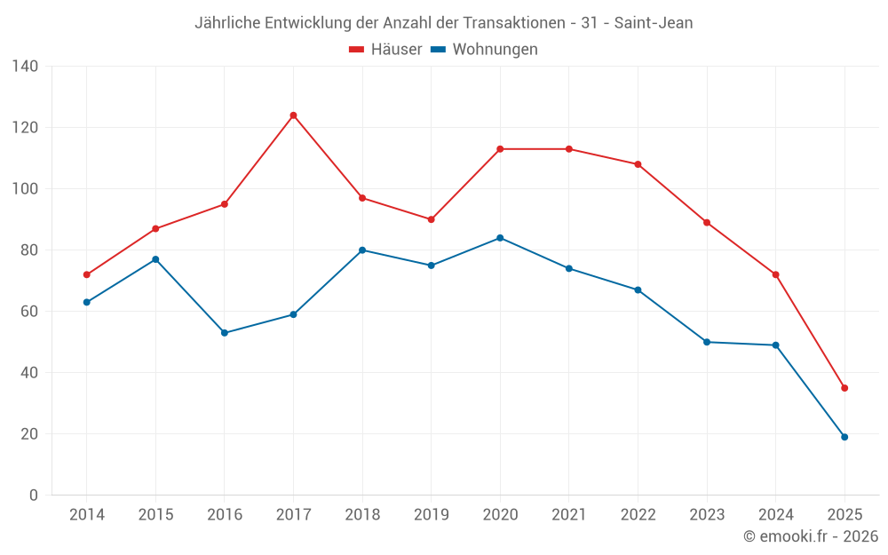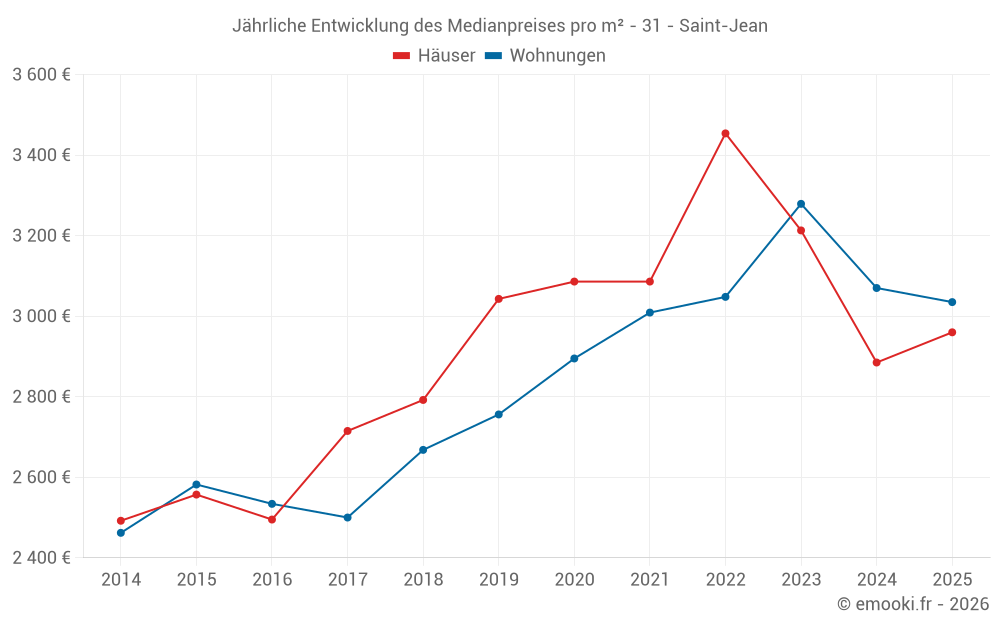Der Durchschnittspreis auf den 35 Hausgeschäften der letzten 6 Monate in der Gemeinde Saint-Jean betrug 2 960 € pro Quadratmeter für einen mittleren Immobilienwert von 275 300 €. Über diesen Zeitraum hinweg lagen 60% der Transaktionen zwischen 2 498 und 3 509 € pro Quadratmeter (vom 2. bis zum 8. Dezil).
