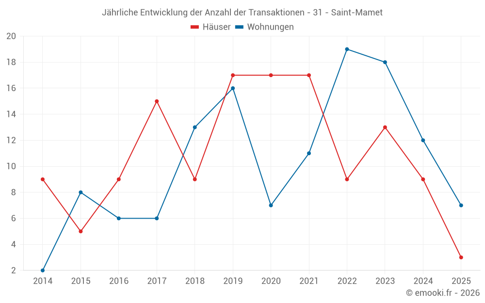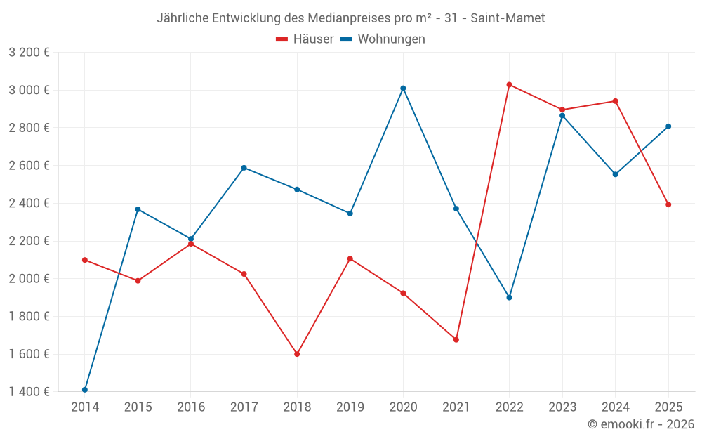 Der Durchschnittspreis auf den 25 Wohnungstransaktionen der letzten 24 Monate in der Gemeinde Saint-Mamet betrug 2 804 € pro Quadratmeter für einen mittleren Immobilienwert von 112 000 €. Über diesen Zeitraum hinweg lagen 60% der Transaktionen zwischen 2 149 und 3 156 € pro Quadratmeter (vom 2. bis zum 8. Dezil).