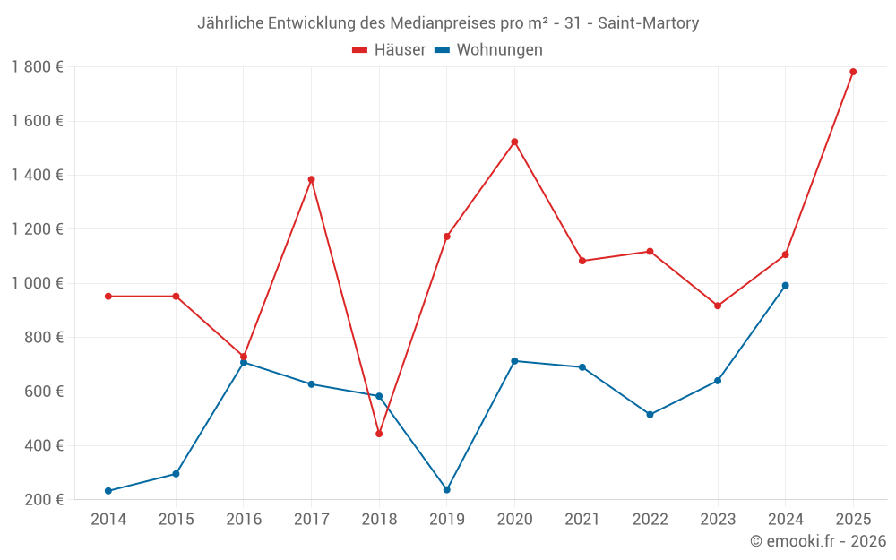 Der Durchschnittspreis auf den 17 Hausgeschäften der letzten 24 Monate in der Gemeinde Saint-Martory betrug 1 025 € pro Quadratmeter für einen mittleren Immobilienwert von 140 200 €. Über diesen Zeitraum hinweg lagen 60% der Transaktionen zwischen 707 und 1 767 € pro Quadratmeter (vom 2. bis zum 8. Dezil).