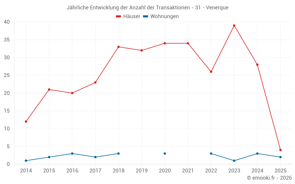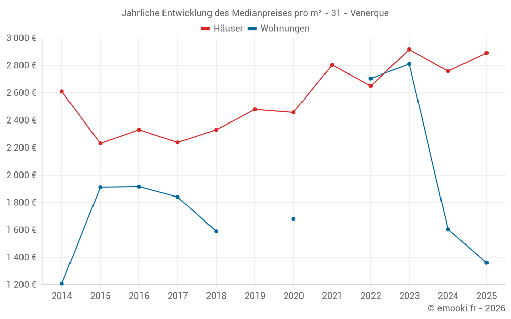 Der Durchschnittspreis auf den 16 Hausgeschäften der letzten 12 Monate in der Gemeinde Venerque betrug 2 914 € pro Quadratmeter für einen mittleren Immobilienwert von 301 482 €. Über diesen Zeitraum hinweg lagen 60% der Transaktionen zwischen 2 537 und 3 548 € pro Quadratmeter (vom 2. bis zum 8. Dezil).