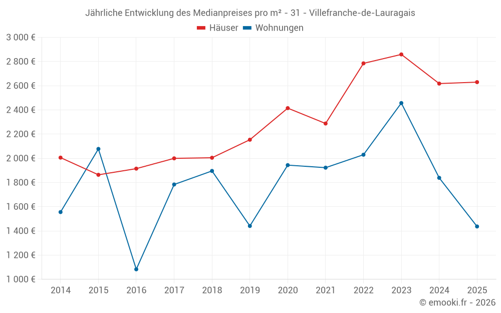 Der Durchschnittspreis auf den 21 Hausgeschäften der letzten 6 Monate in der Gemeinde Villefranche-de-Lauragais betrug 2 630 € pro Quadratmeter für einen mittleren Immobilienwert von 279 830 €. Über diesen Zeitraum hinweg lagen 60% der Transaktionen zwischen 2 145 und 3 109 € pro Quadratmeter (vom 2. bis zum 8. Dezil).