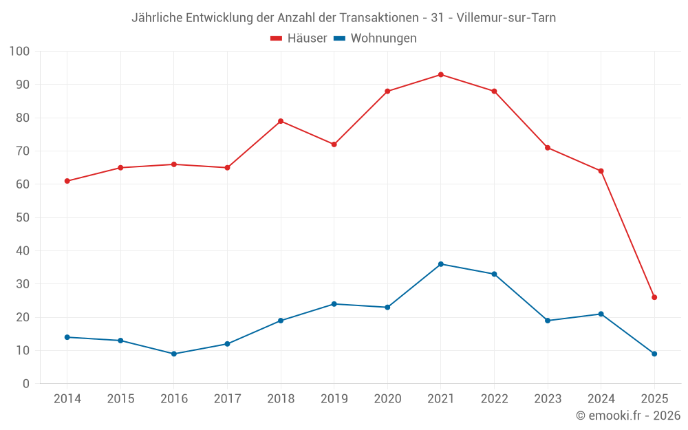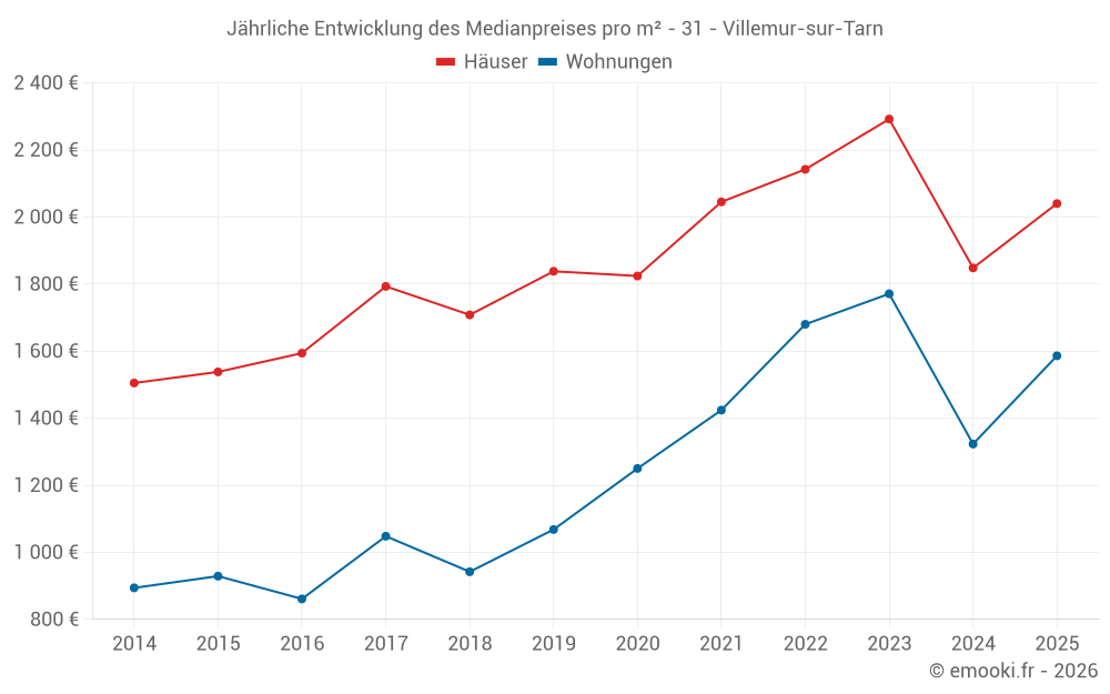 Der Durchschnittspreis auf den 18 Wohnungstransaktionen der letzten 12 Monate in der Gemeinde Villemur-sur-Tarn betrug 1 547 € pro Quadratmeter für einen mittleren Immobilienwert von 70 000 €. Über diesen Zeitraum hinweg lagen 60% der Transaktionen zwischen 1 033 und 2 009 € pro Quadratmeter (vom 2. bis zum 8. Dezil).
