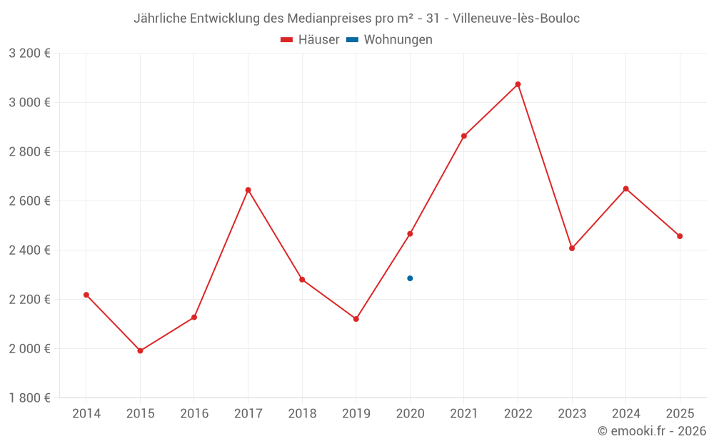 Der Durchschnittspreis auf den 28 Hausgeschäften der letzten 24 Monate in der Gemeinde Villeneuve-lès-Bouloc betrug 2 546 € pro Quadratmeter für einen mittleren Immobilienwert von 289 725 €. Über diesen Zeitraum hinweg lagen 60% der Transaktionen zwischen 1 940 und 3 001 € pro Quadratmeter (vom 2. bis zum 8. Dezil).