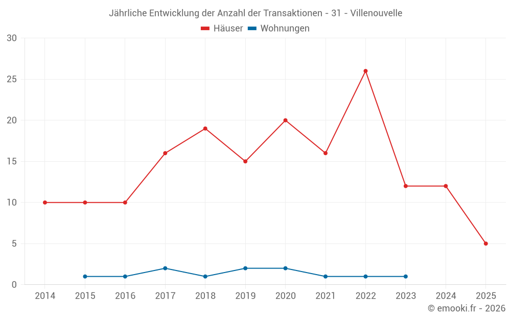 Der Durchschnittspreis auf den 22 Hausgeschäften der letzten 24 Monate in der Gemeinde Villenouvelle betrug 2 375 € pro Quadratmeter für einen mittleren Immobilienwert von 243 400 €. Über diesen Zeitraum hinweg lagen 60% der Transaktionen zwischen 1 913 und 3 110 € pro Quadratmeter (vom 2. bis zum 8. Dezil).