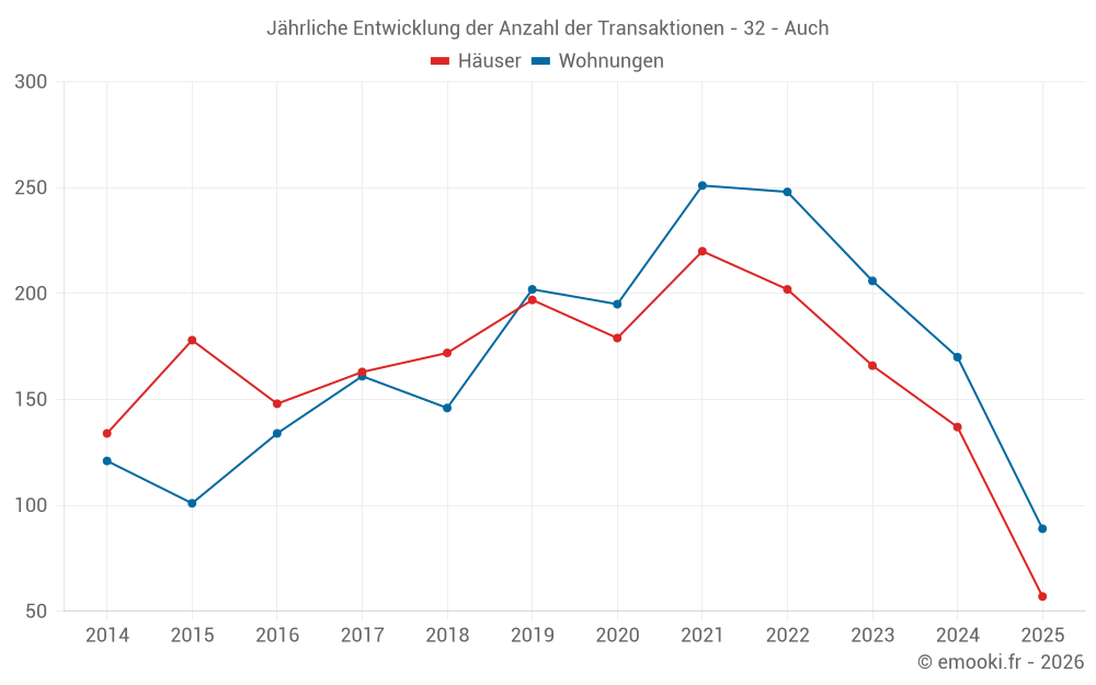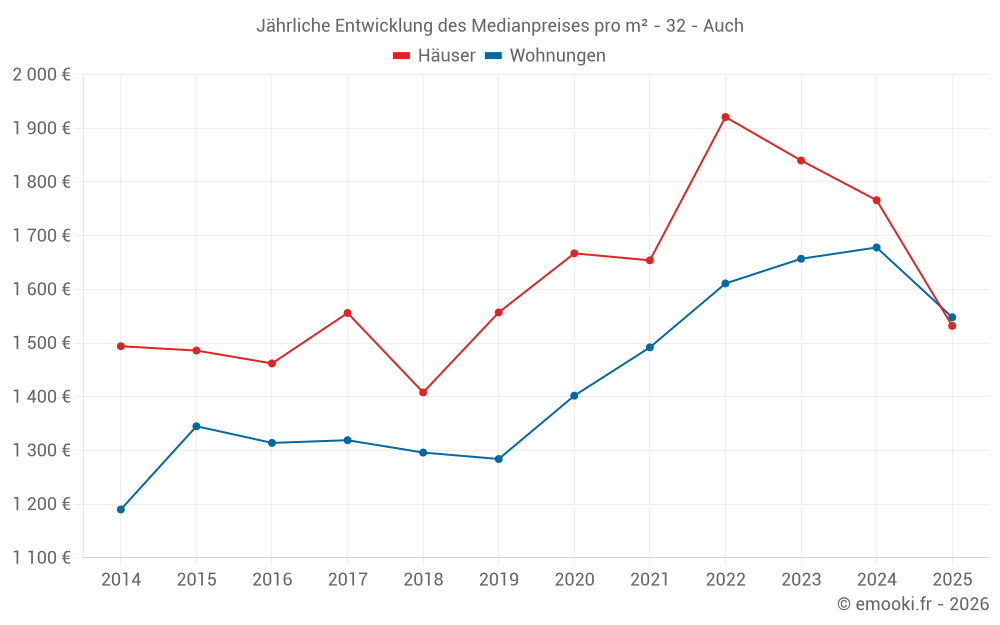 Der Durchschnittspreis auf den 32 Hausgeschäften der letzten 3 Monate in der Gemeinde Auch betrug 1 508 € pro Quadratmeter für einen mittleren Immobilienwert von 146 500 €. Über diesen Zeitraum hinweg lagen 60% der Transaktionen zwischen 1 023 und 1 956 € pro Quadratmeter (vom 2. bis zum 8. Dezil).