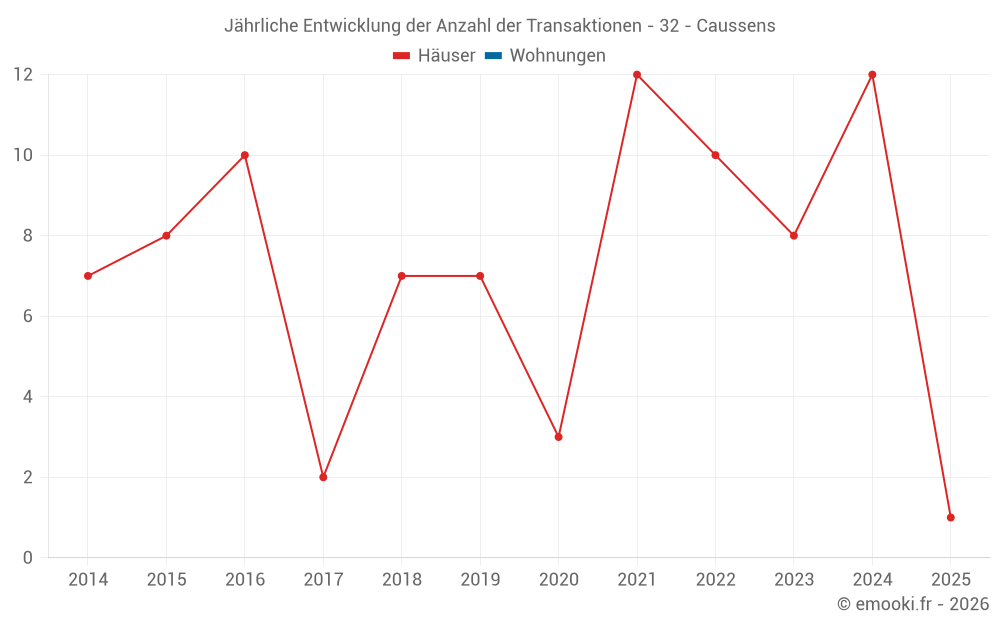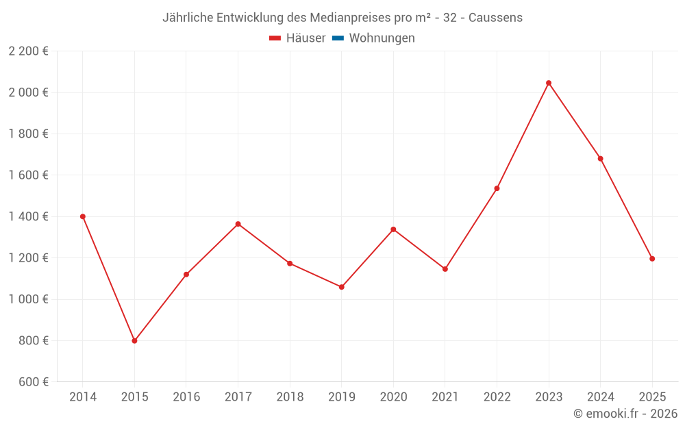 Der Durchschnittspreis auf den 17 Hausgeschäften der letzten 24 Monate in der Gemeinde Caussens betrug 1 798 € pro Quadratmeter für einen mittleren Immobilienwert von 199 000 €. Über diesen Zeitraum hinweg lagen 60% der Transaktionen zwischen 1 203 und 2 596 € pro Quadratmeter (vom 2. bis zum 8. Dezil).