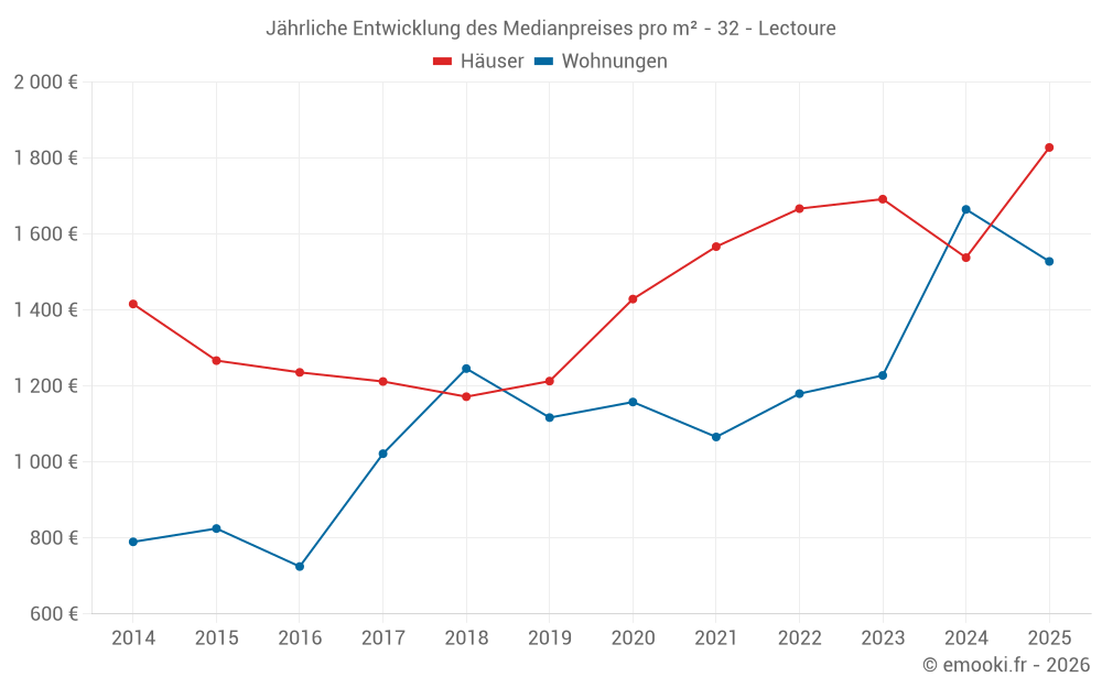 Der Durchschnittspreis auf den 21 Hausgeschäften der letzten 6 Monate in der Gemeinde Lectoure betrug 1 828 € pro Quadratmeter für einen mittleren Immobilienwert von 180 000 €. Über diesen Zeitraum hinweg lagen 60% der Transaktionen zwischen 1 000 und 2 294 € pro Quadratmeter (vom 2. bis zum 8. Dezil).