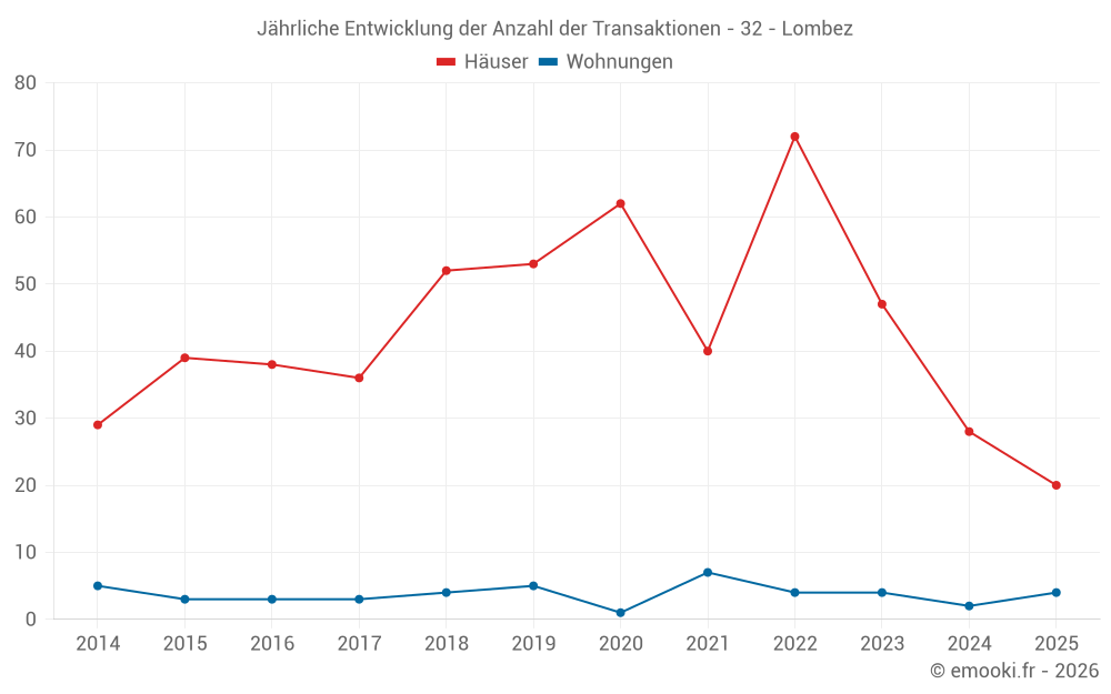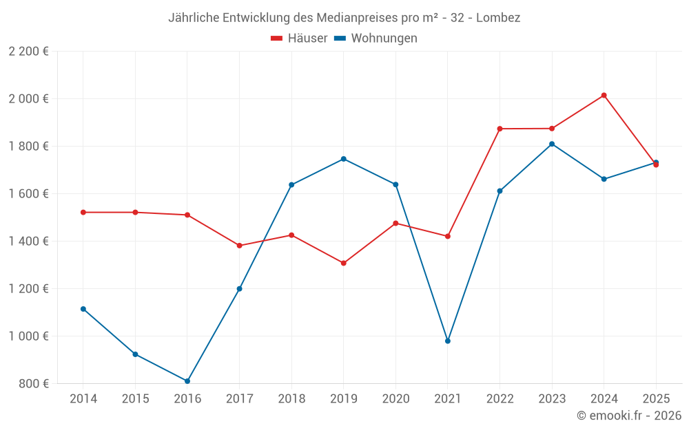 Der Durchschnittspreis auf den 20 Hausgeschäften der letzten 6 Monate in der Gemeinde Lombez betrug 1 722 € pro Quadratmeter für einen mittleren Immobilienwert von 169 582 €. Über diesen Zeitraum hinweg lagen 60% der Transaktionen zwischen 1 333 und 2 589 € pro Quadratmeter (vom 2. bis zum 8. Dezil).