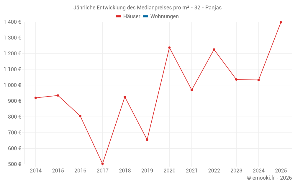 Der Durchschnittspreis auf den 14 Hausgeschäften der letzten 24 Monate in der Gemeinde Panjas betrug 1 150 € pro Quadratmeter für einen mittleren Immobilienwert von 120 000 €. Über diesen Zeitraum hinweg lagen 60% der Transaktionen zwischen 523 und 1 508 € pro Quadratmeter (vom 2. bis zum 8. Dezil).