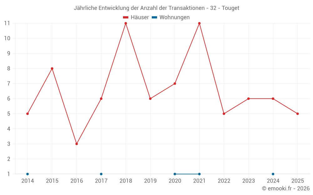 Der Durchschnittspreis auf den 14 Hausgeschäften der letzten 24 Monate in der Gemeinde Touget betrug 1 818 € pro Quadratmeter für einen mittleren Immobilienwert von 160 400 €. Über diesen Zeitraum hinweg lagen 60% der Transaktionen zwischen 1 227 und 2 116 € pro Quadratmeter (vom 2. bis zum 8. Dezil).