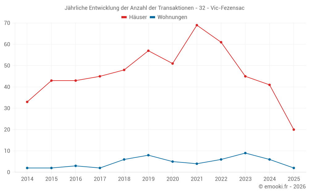 Der Durchschnittspreis auf den 20 Hausgeschäften der letzten 6 Monate in der Gemeinde Vic-Fezensac betrug 1 084 € pro Quadratmeter für einen mittleren Immobilienwert von 111 155 €. Über diesen Zeitraum hinweg lagen 60% der Transaktionen zwischen 457 und 1 685 € pro Quadratmeter (vom 2. bis zum 8. Dezil).