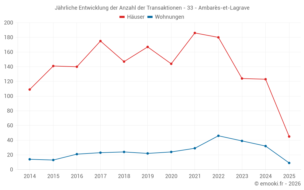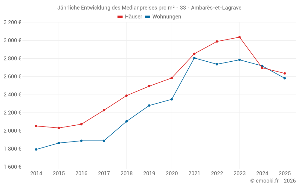 Der Durchschnittspreis auf den 29 Wohnungstransaktionen der letzten 12 Monate in der Gemeinde Ambarès-et-Lagrave betrug 2 644 € pro Quadratmeter für einen mittleren Immobilienwert von 123 000 €. Über diesen Zeitraum hinweg lagen 60% der Transaktionen zwischen 2 313 und 3 010 € pro Quadratmeter (vom 2. bis zum 8. Dezil).