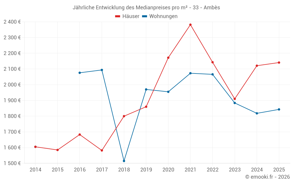 Der Durchschnittspreis auf den 22 Hausgeschäften der letzten 12 Monate in der Gemeinde Ambès betrug 2 142 € pro Quadratmeter für einen mittleren Immobilienwert von 197 750 €. Über diesen Zeitraum hinweg lagen 60% der Transaktionen zwischen 1 787 und 2 639 € pro Quadratmeter (vom 2. bis zum 8. Dezil).