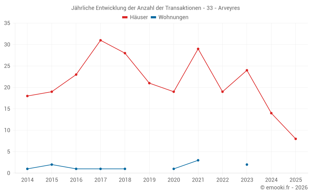 Der Durchschnittspreis auf den 16 Hausgeschäften der letzten 12 Monate in der Gemeinde Arveyres betrug 2 614 € pro Quadratmeter für einen mittleren Immobilienwert von 238 840 €. Über diesen Zeitraum hinweg lagen 60% der Transaktionen zwischen 1 765 und 2 988 € pro Quadratmeter (vom 2. bis zum 8. Dezil).